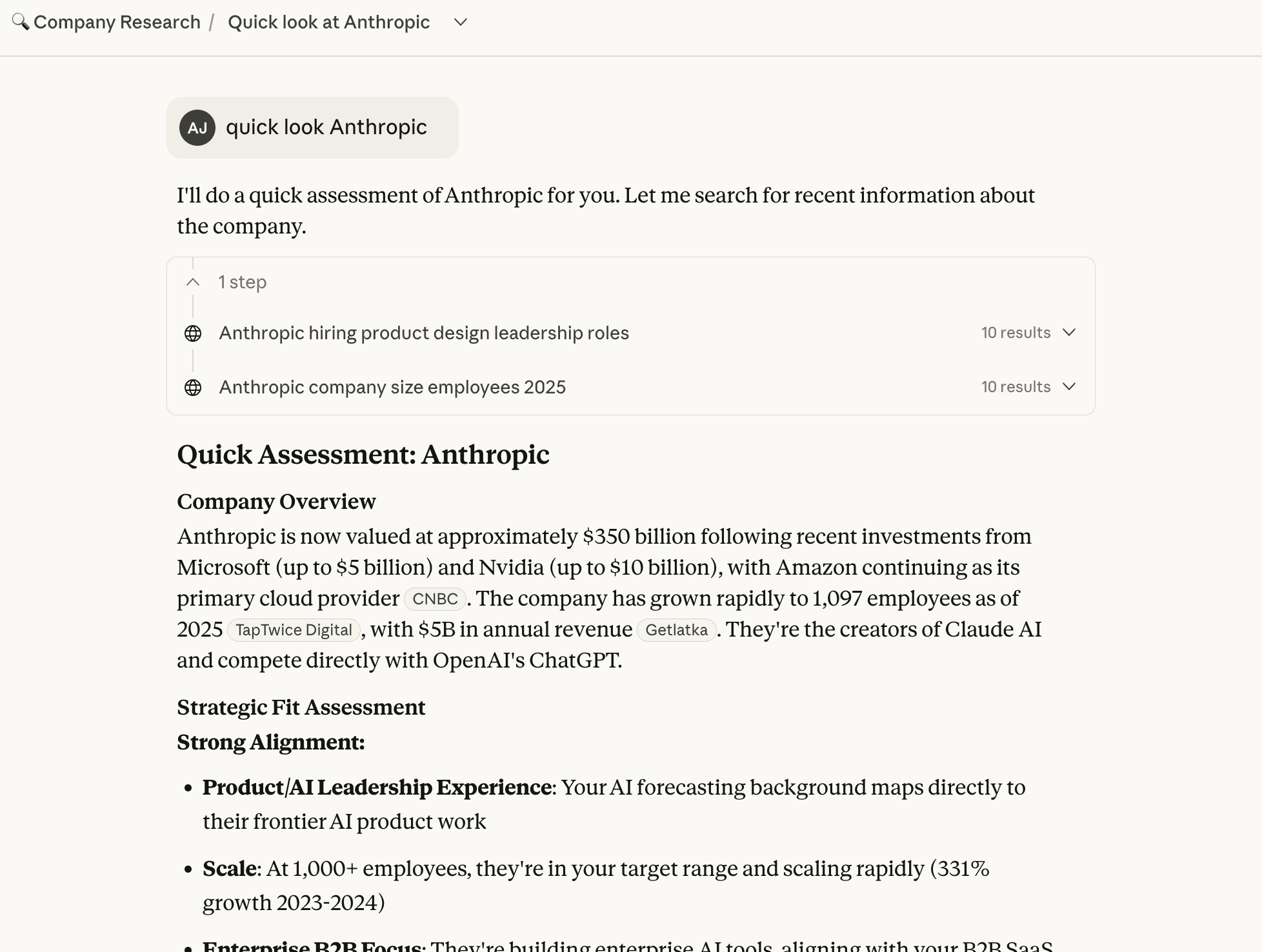 I set up a Claude project that generates comprehensive company analyses with cited sources, red flag detection, and strategic fit evaluation against my background, goals and experience.