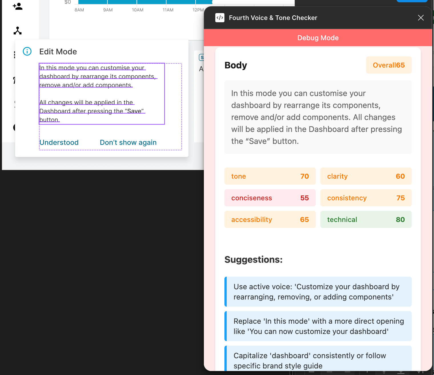 I built a Figma extension that checks UI copy against the style guide, providing scoring and text recommendations for voice, tone, grammar, and spelling. I've also encouraged members of my teams to use LLMs for one-off needs. For example, a Bulgarian designer used ChatGPT to generate a list of realistic British names for a UI to save time. This the type of work is easily turned into a quick utility and shared with the larger team for everyone's benefit.